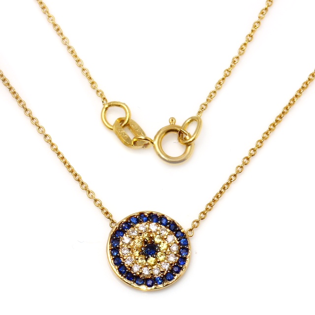 This beautiful 14k gold evil eye with diamonds and sapphires is a great piece to add to any collection of jewels! It has yellow sapphires, blue sapphires and diamonds all around. It’s the perfect piece to have and never take off. The evil eye is believed to ward off an evil and bless the person wearing it! I can attach it to a 16″ or 18″ 14k gold chain. Great gift for bridesmaids, birthdays, graduation, or any other special occasion.