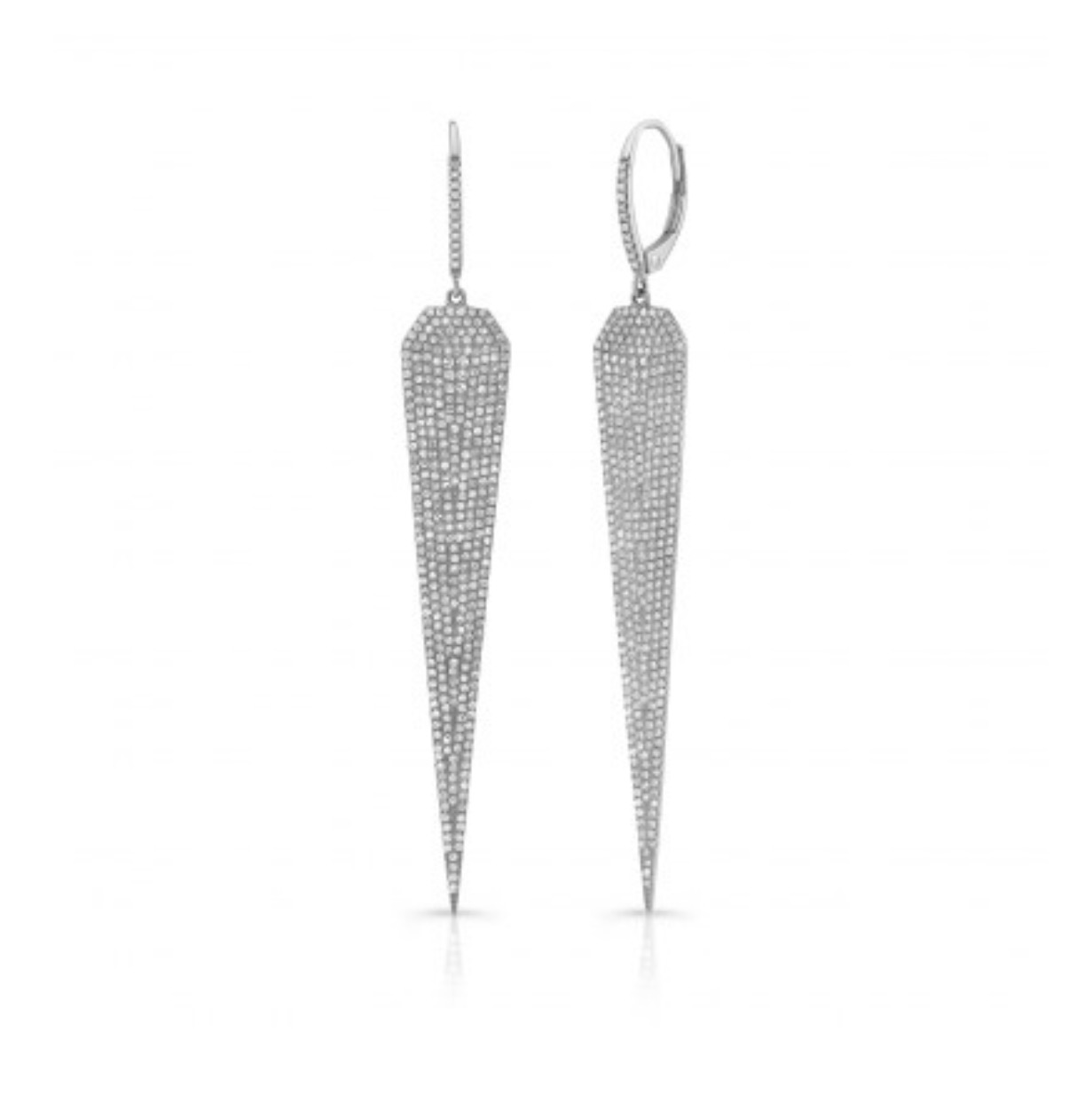 These diamond spear earrings are sure to compliment any outfit. Great for a night out on the town or any special occasion! These dagger like earrings are encrusted with pave set diamonds that bling beautifully! They are available in your choice of metal.