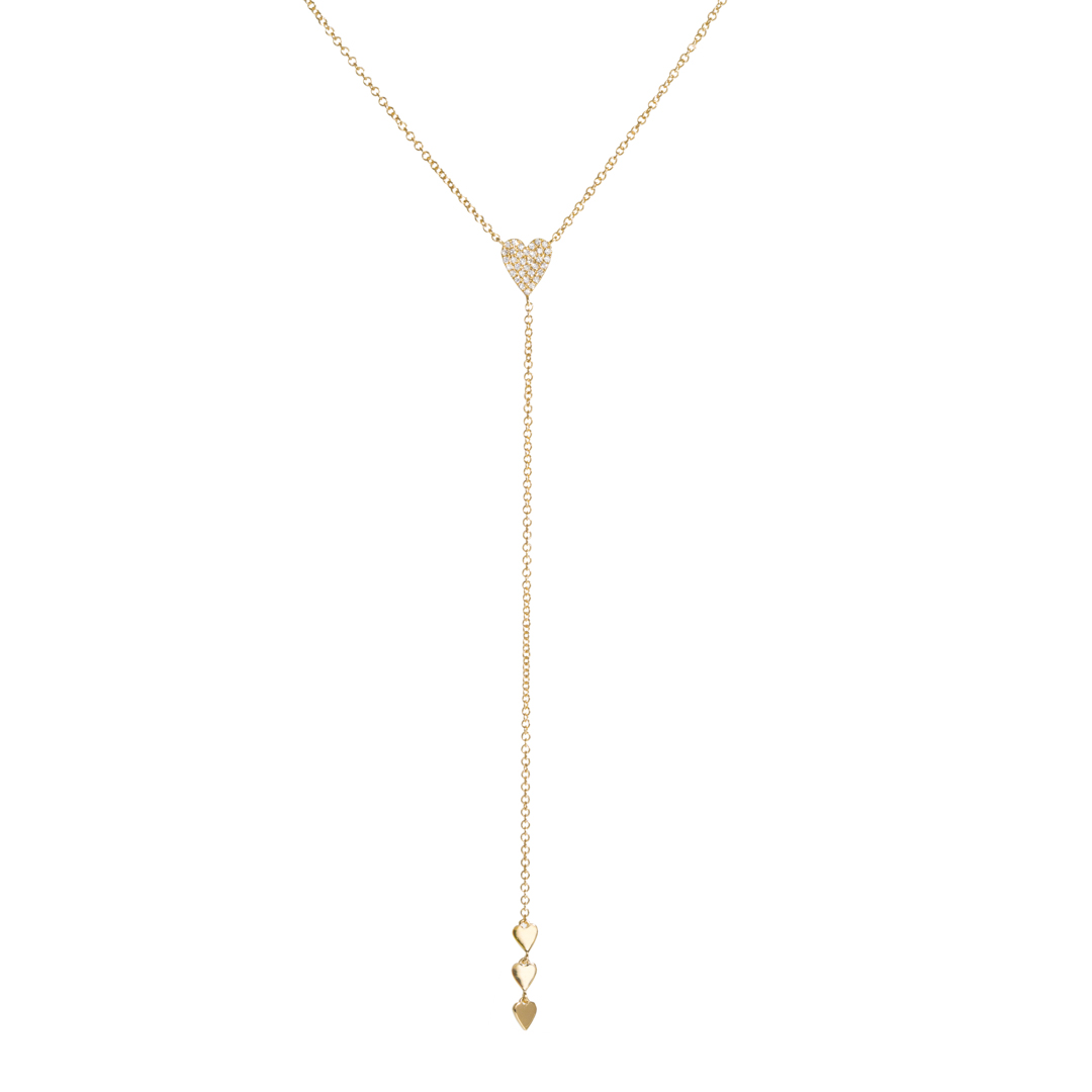 This beautiful 14k gold diamond heart lariat with 3 tiny gold hearts at the end of the lariat. Perfect for jeans and tee or your little black dress.