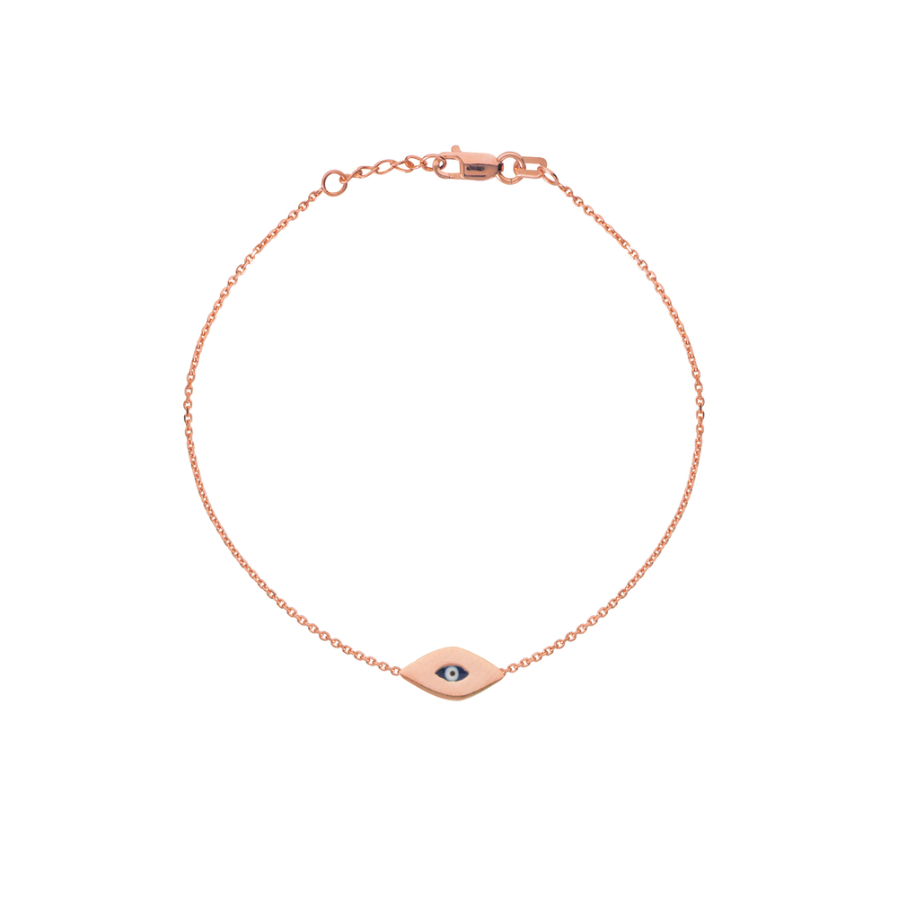 This cute 14k gold enamel evil eye bracelet is dainty yet sturdy. It’s a great bracelet to wear with a watch or other bracelets. It has extension loops at the end so it can be worn anywhere from 7″-7.5″.