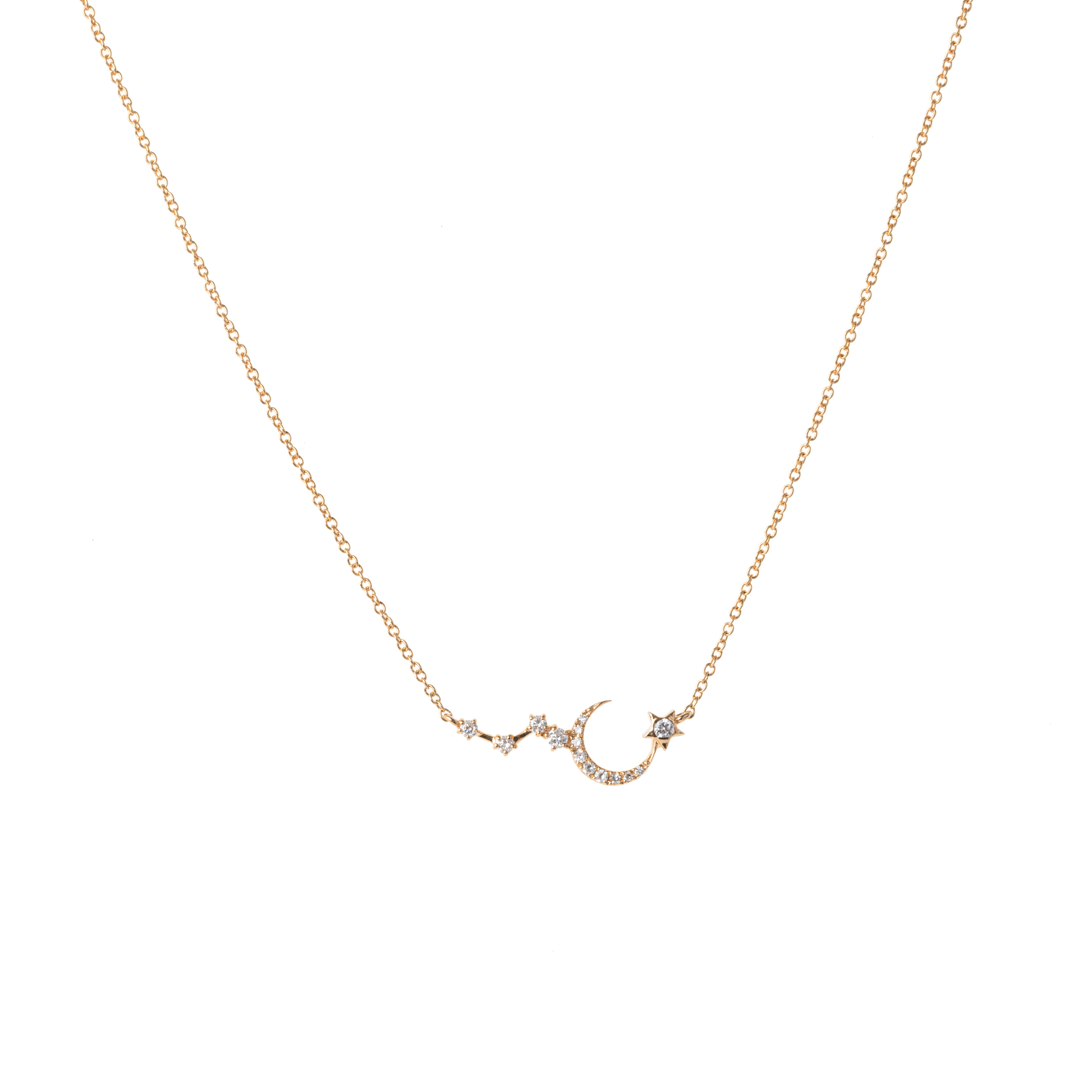 Beautiful 14k gold diamond Crescent Moon & Star necklace. The moon is attached at the center of the chain, the star from the side with diamond accents. Always remember to reach for the stars!! Adjustable chain length anywhere from 16″- 18″.