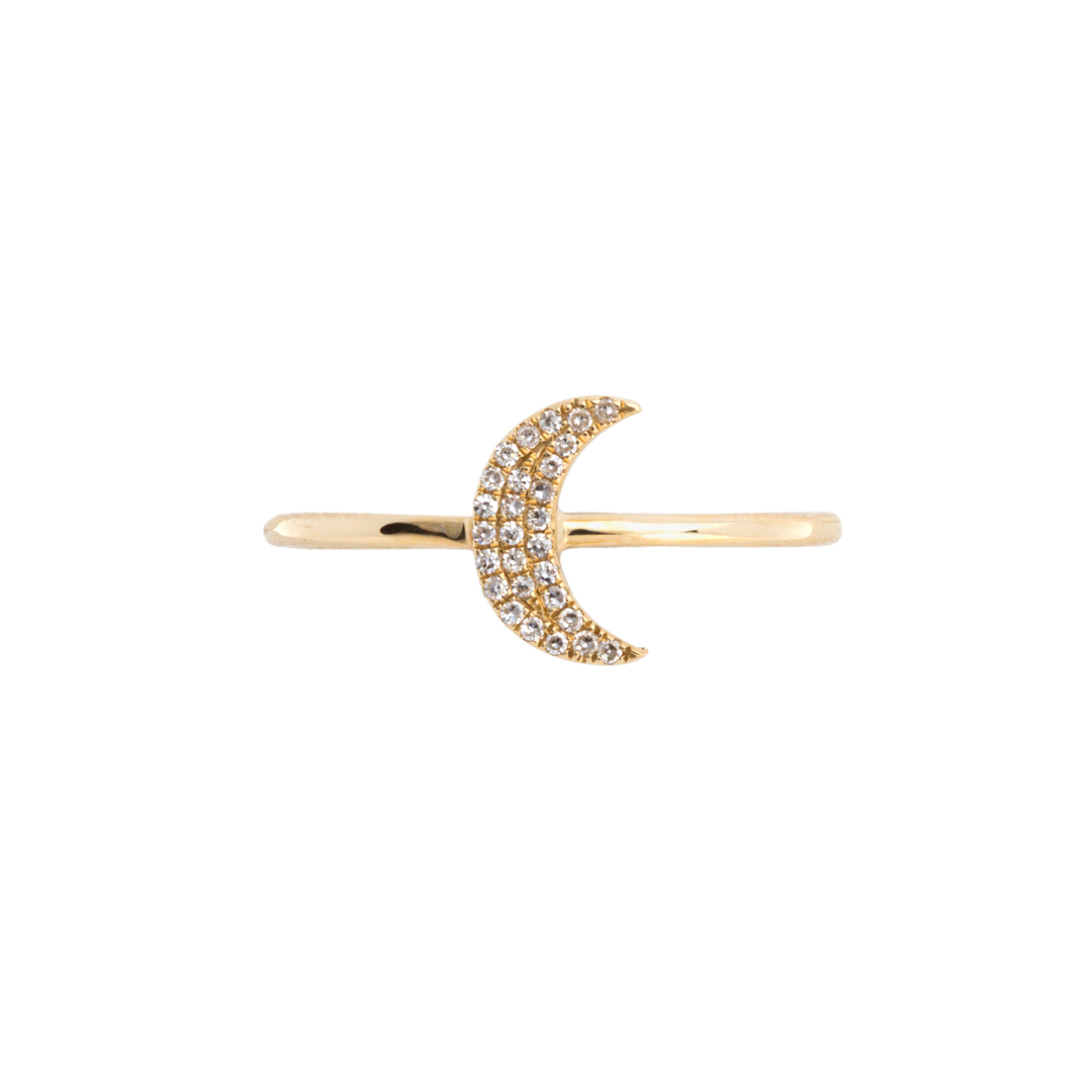 This minimal solid 14k gold diamond crescent moon stackable ring is the perfect addition to your celestial jewelry collection. The diamonds on the moon are the perfect accent! This ring is available in 14k yellow, rose, and white gold. –just choose your desired metal from the drop-down menu!